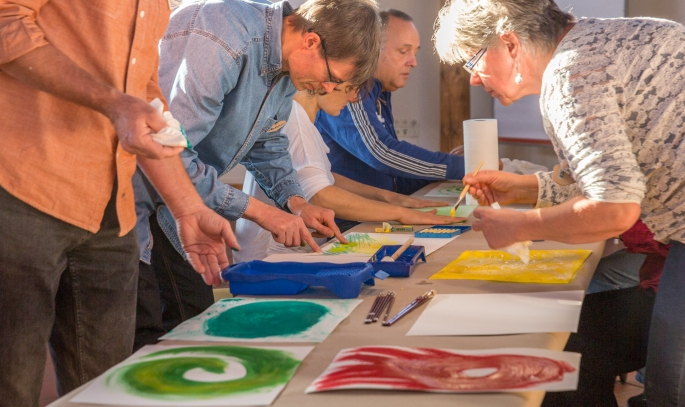 Dieser Text ist märchenhaft, poetisch, anschaulich und regte geradezu an zu einem Kreativworkshop: Jeder malte in einfachen Symbolen und mit nur zwei Farben seine momentane Vorstellung seiner Insel. Es folgte ein Austausch in Zweiergruppen, in denen die Bilder eine umfassendere Bedeutung bekamen. Der Workshop war in eine lebendige, eifrige und freundliche Atmosphäre getaucht.