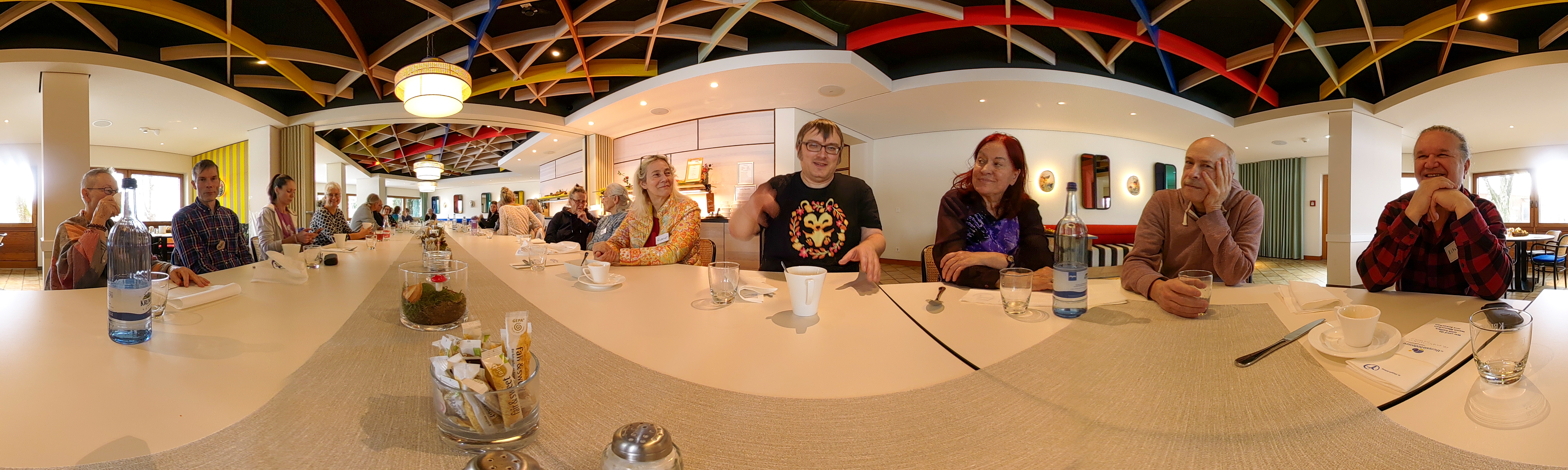 Nachmittags: Nach dem Mittagessen gönnten wir uns eine längere Pause. Einige nutzten die Zeit, um trotz stürmischem Wetter am verschneiten Bodensee die Natur zu genießen. Um 15:30 Uhr trafen wir uns zum Fototermin, bevor es bei Kaffee und Kuchen weiterging. Im Plenum fassten die Gruppen ihre Erkenntnisse zusammen, und im Anschluss leitete Richard Dvorak eine besondere Übung an: „Multidimensionales Aufstellen“, das bereits 2023 großen Anklang fand.